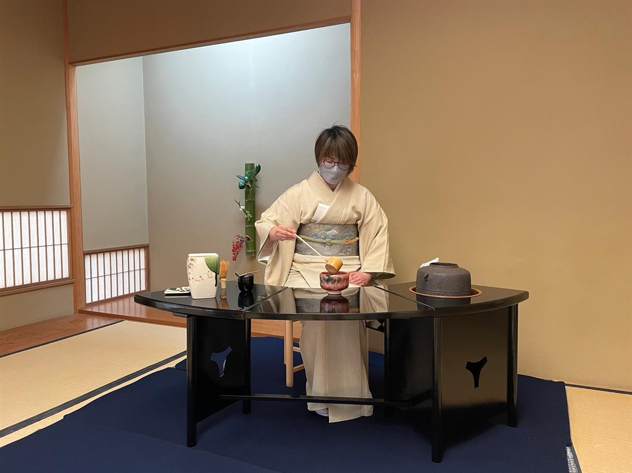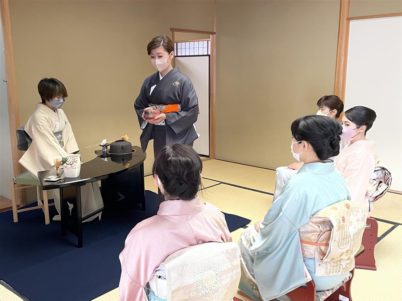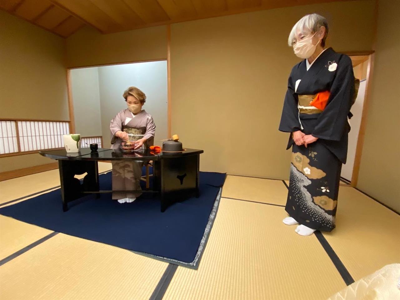 お点前のSさんは入門して2年。立礼と畳、両方の稽古に熱心な方です。質問も受けます。