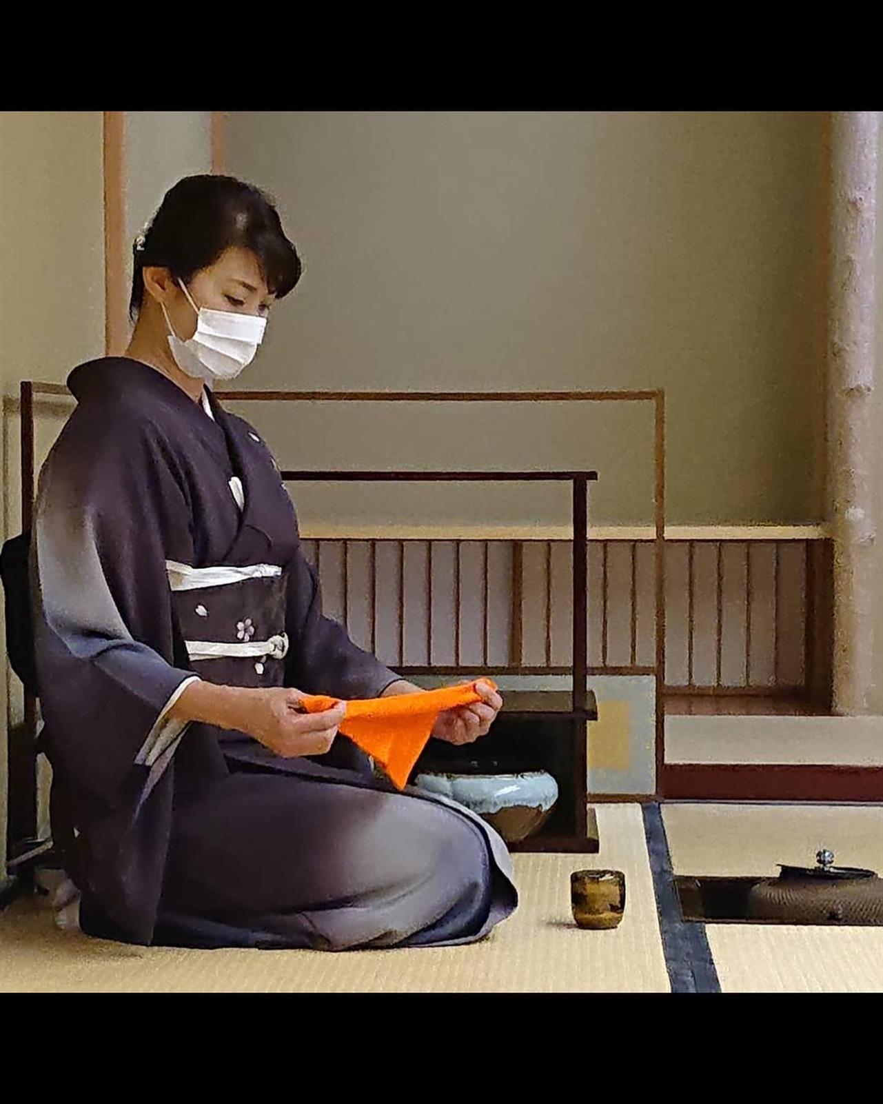 お点前のIさんはお茶の稽古と同時に着付けを習いました。今では角出しや銀座結びなど お洒落な帯結びにもチャレンジして楽しんでいます。また、毎回お茶の稽古に着物で来ています。