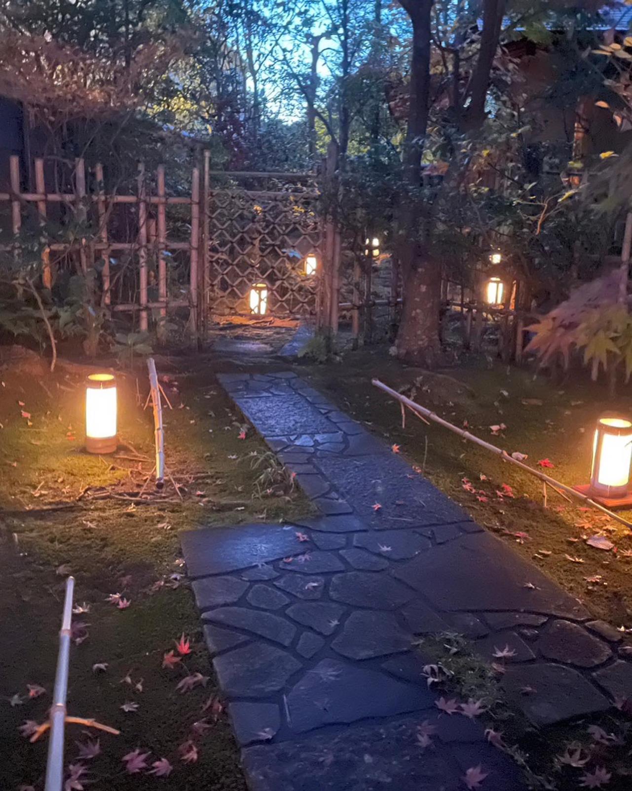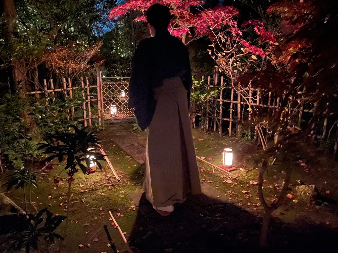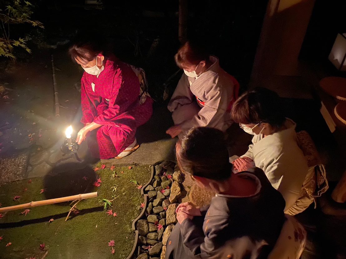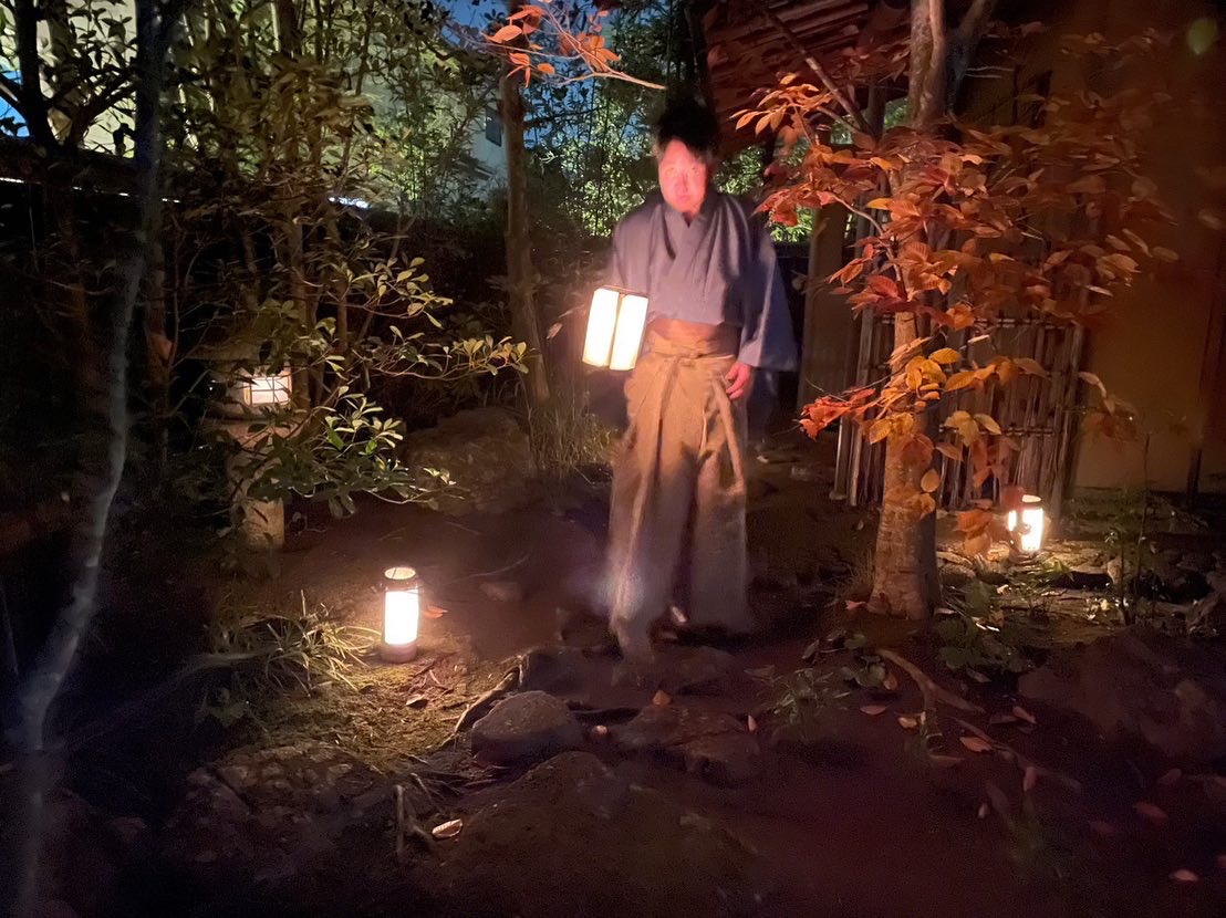 お手入れされた露路には行燈が灯され、紅葉がハラハラと舞い落ち夜の帳が降りて、お席への期待は最高潮となります。