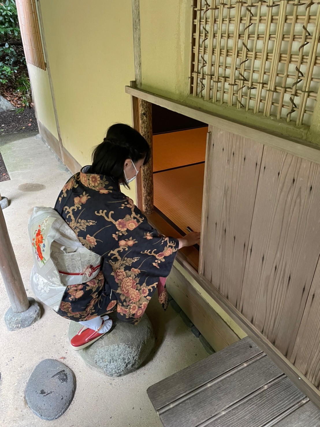 だれであっても頭を下げないと入れない茶室は、身分は関係なく、茶室では皆平等を意味します。